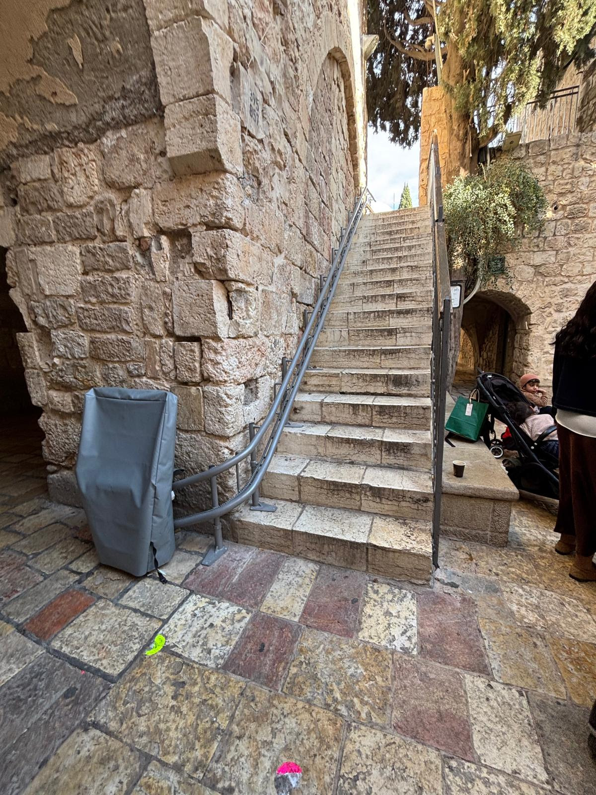 This is a chair lift located in Jerusalem, Israel that leads to a roof terrace to view the Old City. This is not allowed in certain States in the United States. Here in Texas, chair lifts cannot be part of an accessible route.