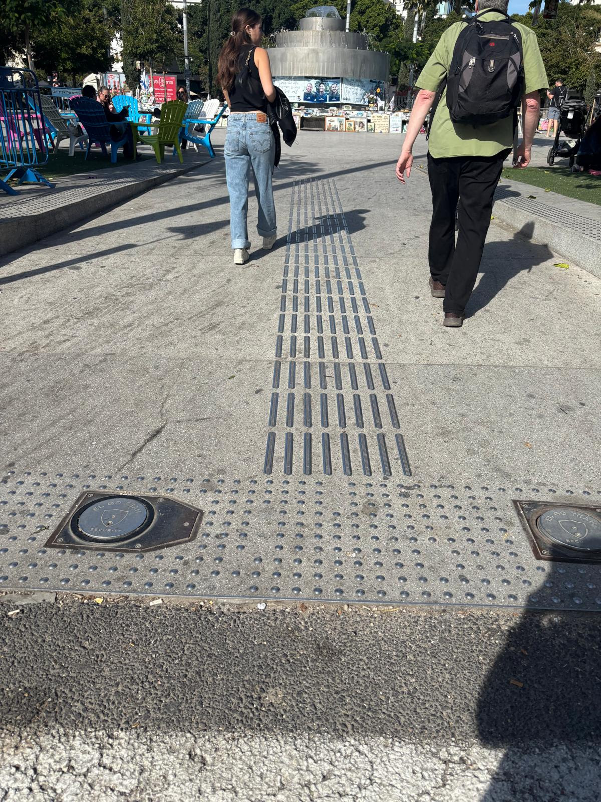 The detectable elements in a public right of way provides directional cues to visitors to the Dizengoff fountain in Tel Aviv.