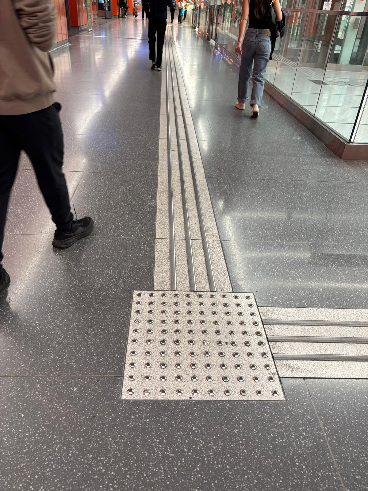 These detectable floor tiles indicate to persons who cannot see which direction is safe to wall. The linear tactile bars provide directional cues and the truncated domes indicate that there is a change in direction.