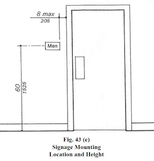 3) Mounting Location and Height. The signage shall be located adjacent to the latch side of the door. Blind people are trained to find the door handle and then look to the wall next to it for signage.