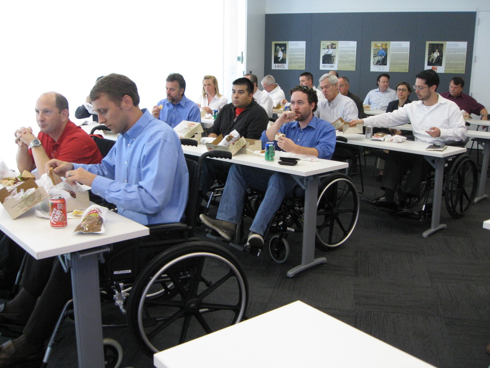 October 27, 2010 was the 6th annual Accessibility Awareness Exercise at the AIA in Dallas, Tx where architects use a wheel chair for one entire day. The idea is that they should “walk in their clients shoes” (pun intended). Architects are trained to design for the disabled, and make their buildings accessible and Universal, but until they sit in the chair for one day, they probably won’t understand fully the impact those pesky circles and knee spaces that they put on their drawings have on the real world.
