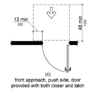 This figure on the other hand, lets us know that this maneuvering clearance applies to a forward approach push side when the doors has BOTH a closer and a latch. This type of door would require an additional 12″ on the latch side