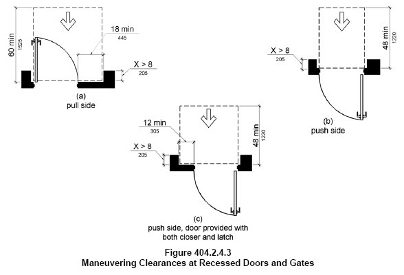 404.2.4.3 Recessed Doors and Gates. Maneuvering clearances for forward approach shall be provided when any obstruction within 18 inches (455 mm) of the latch side of a doorway projects more than 8 inches (205 mm) beyond the face of the door, measured perpendicular to the face of the door or gate.