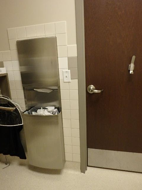 The photo above shows a trash receptacle that is less than 8″ deep and within the maneuvering clearance on the pull side of the door. This is allowed based on the recessed door provisions
